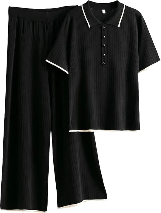 Two Piece Sets for Women Short Sleeve Polo Neck Tops